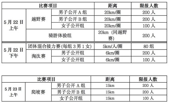 * 团体赛组、淘汰赛、女子公开组(越野赛、爬坡赛)18-55 岁(2003-1966年出生者)