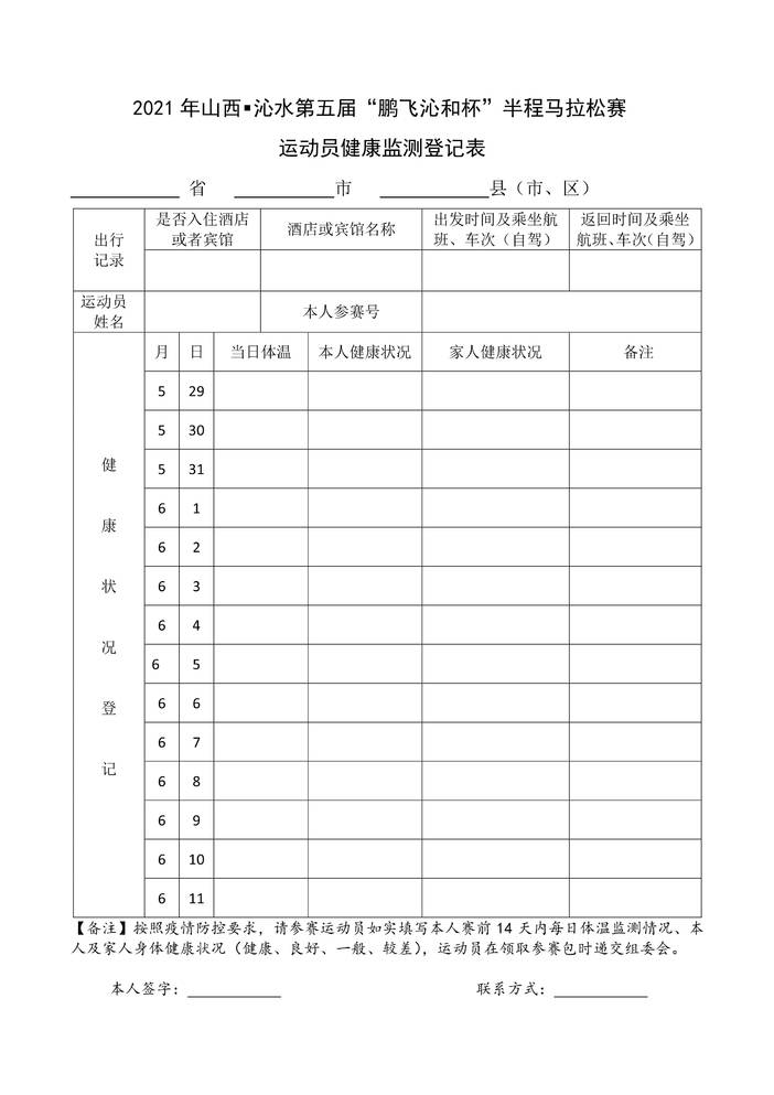 2021年山西▪沁水第五届“鹏飞沁和杯”半程马拉松赛运动员健康监测登记表